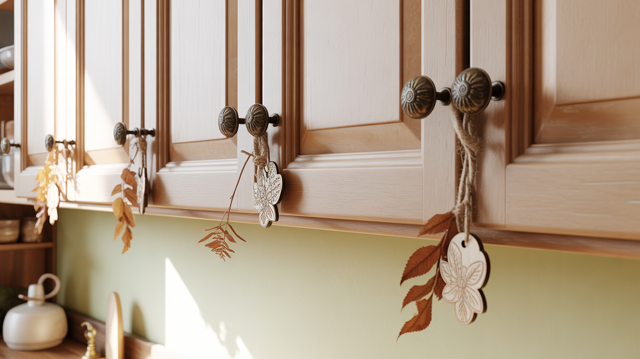 Add twine bows or wrap handles with jute string, then tie on small charms or leaves. It gives your kitchen a rustic, handmade feel with little effort. You can find mini fall charms in craft stores or use small wooden cutouts.