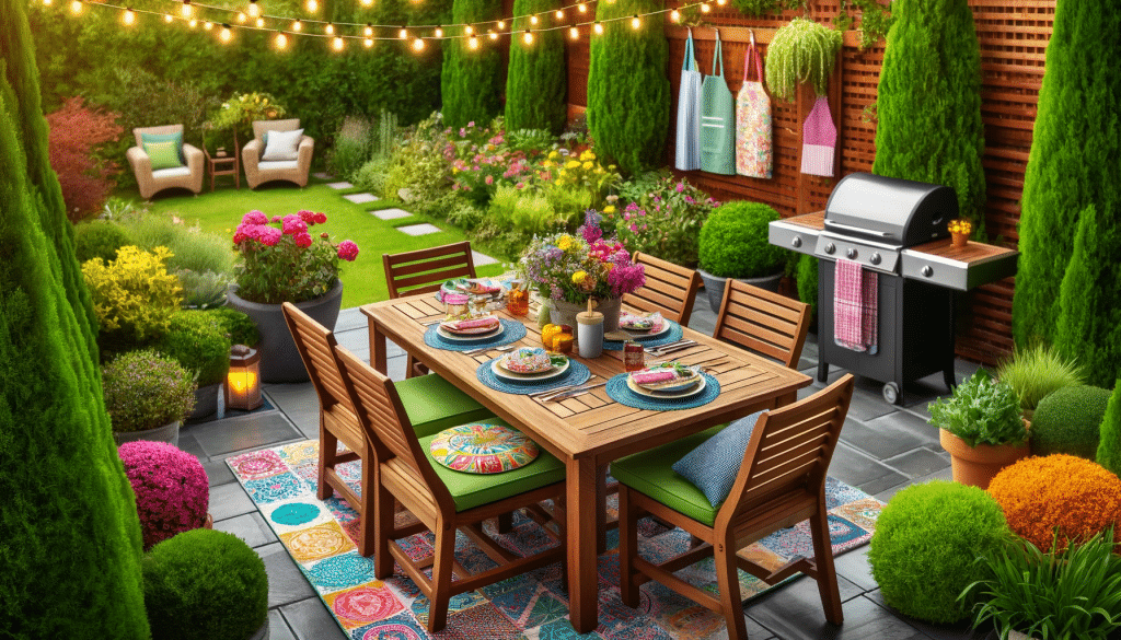 Start with a durable and comfortable dining set that fits the size of your space. Consider adding a BBQ grill, either built-in or portable, to cater to outdoor cooking. To make this area truly personal, incorporate custom items such as coasters, aprons, and placemats with unique designs or family names. These small touches add a personal flair and make the space feel special.