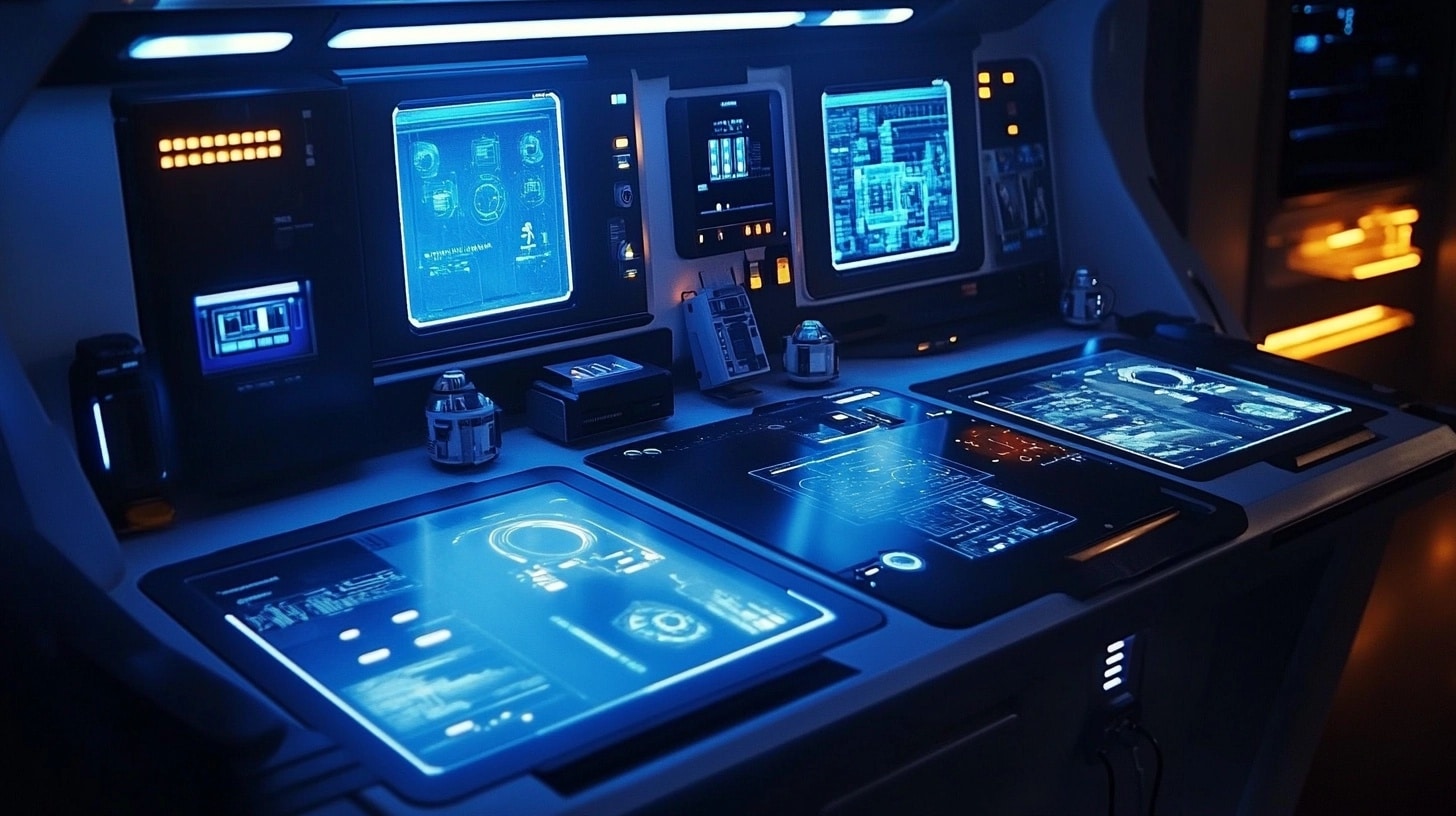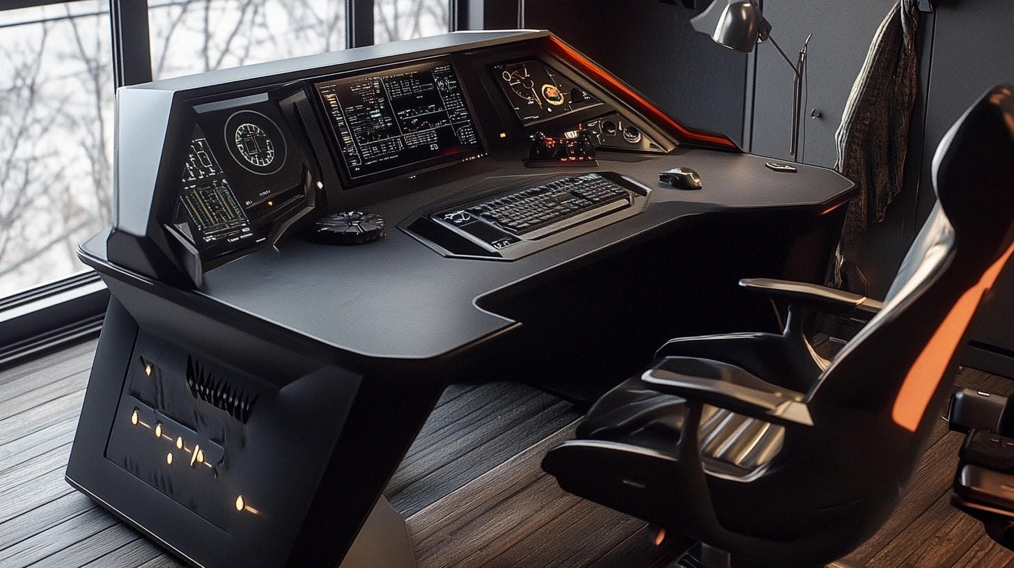 The sleek, dark desk design mirrors the cockpit of a famous spacecraft.