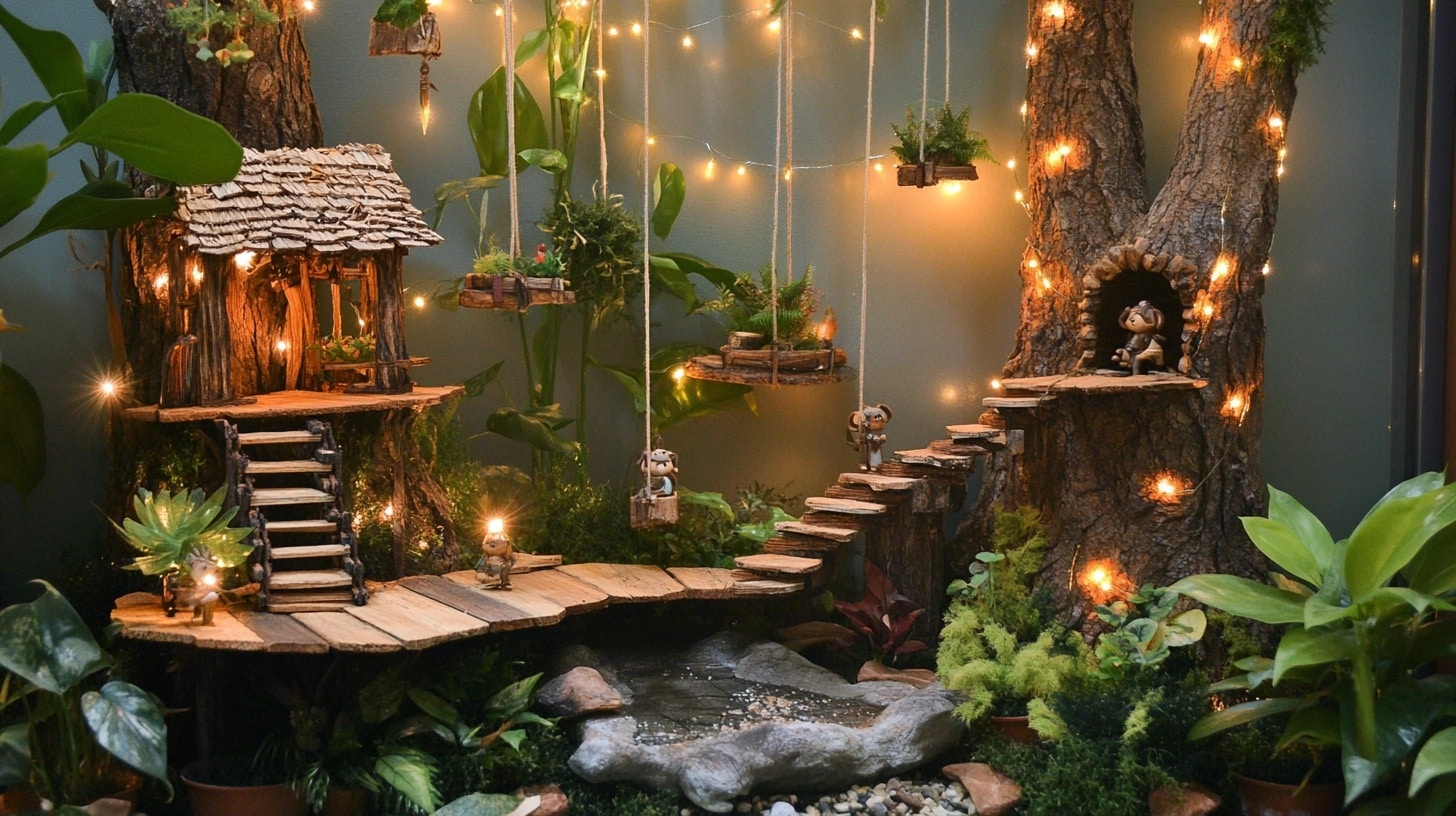 Small trees and plants create a lush, natural atmosphere that feels like stepping into a miniature forest.