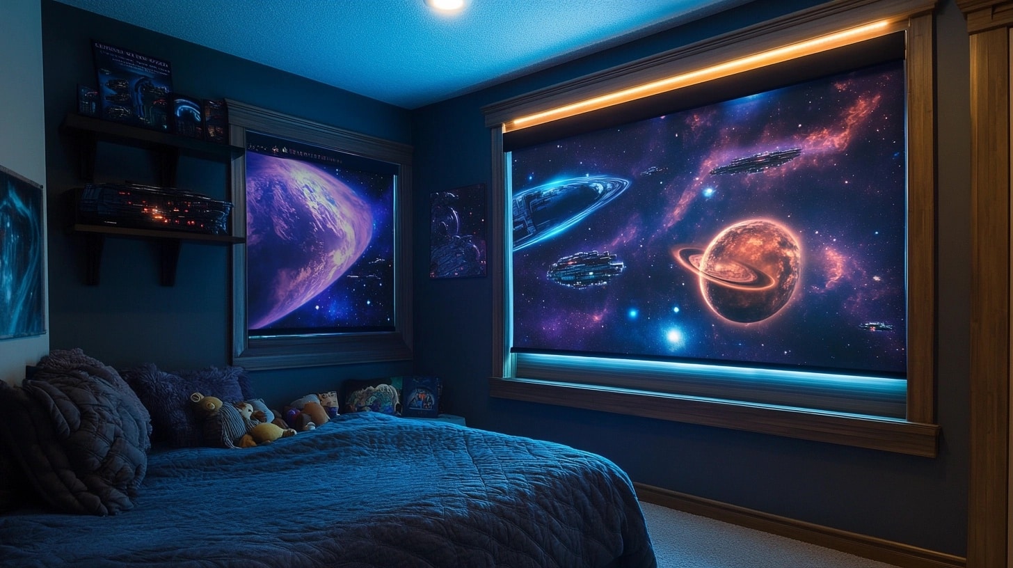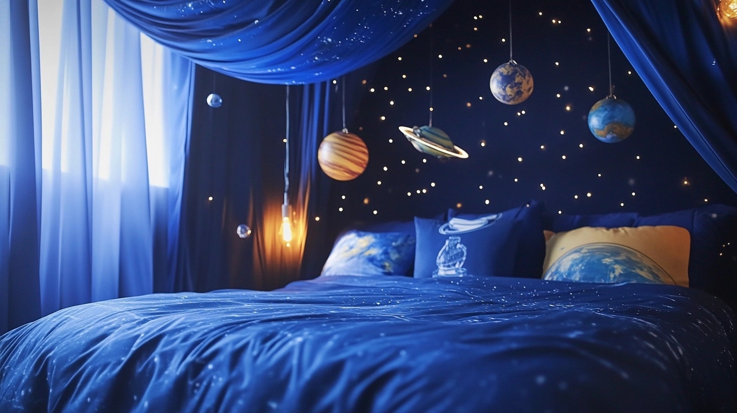 Convert regular lamps with colored bulbs, create wall art using stencils, and make themed pillowcases with fabric paint. Use cardboard and paint to build space station panels or make simple light-up decorations with LED strips.