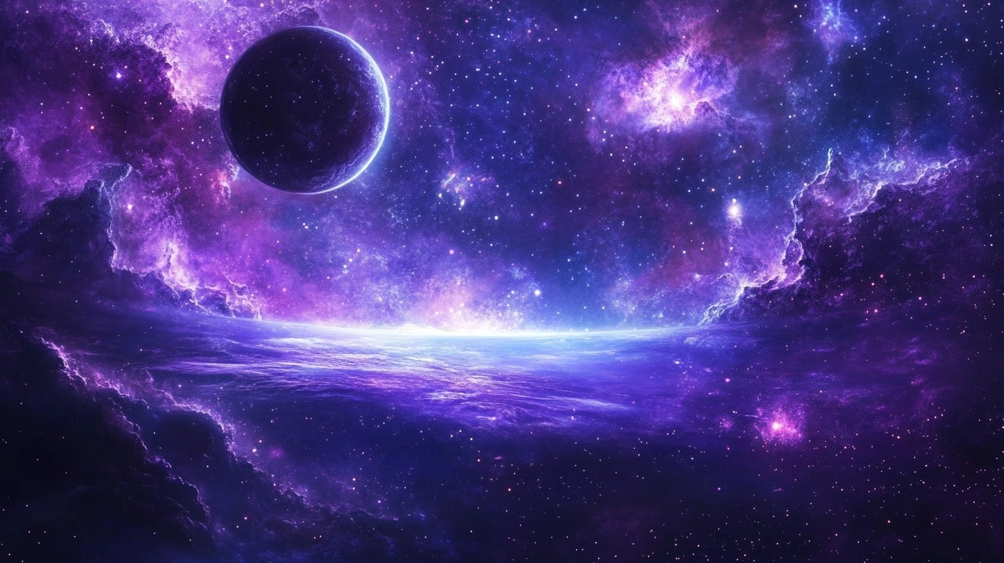 The wall combines rich purples, deep blues, and scattered stars to create an authentic space feeling.