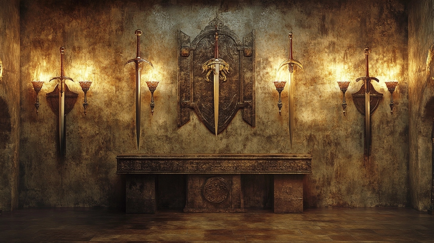 Mounted light-up swords serve as both decoration and practical lighting features.