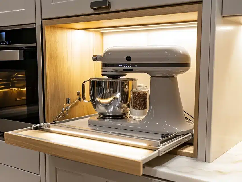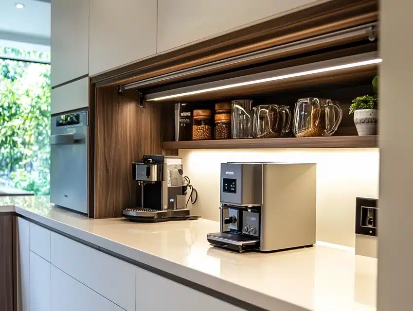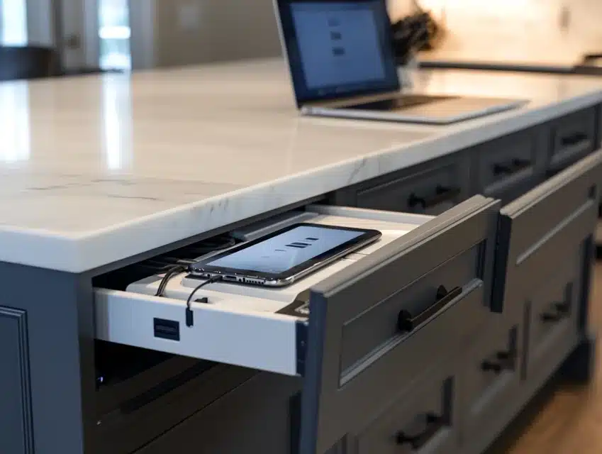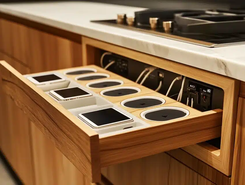 For modern kitchens, I recommend drawer charging stations and appliance garage power strips.