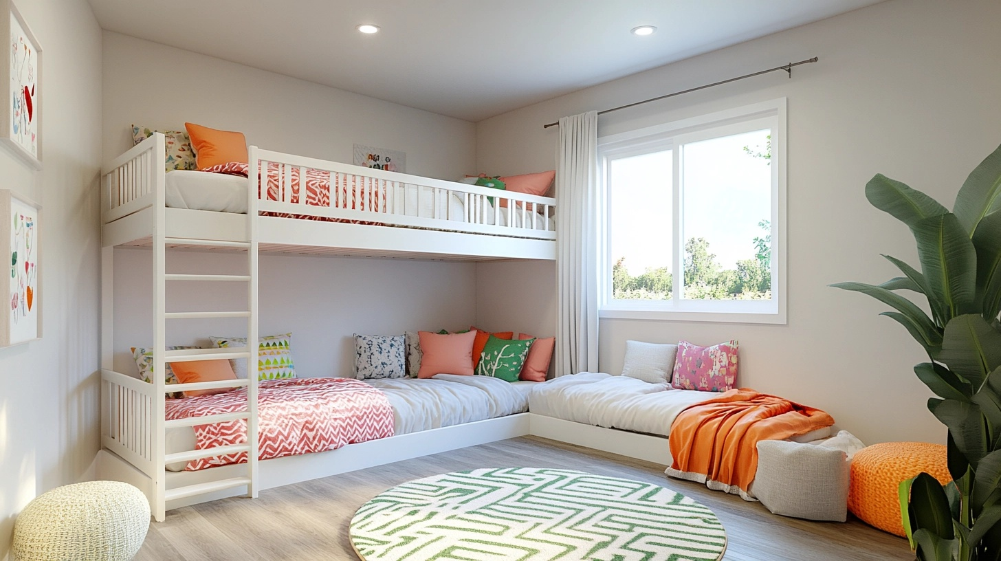Maximize awkward corner spaces by designing L-shaped bunks that allow for better movement and floor space. This smart layout takes advantage of room corners that often go unused, turning them into functional sleeping areas.