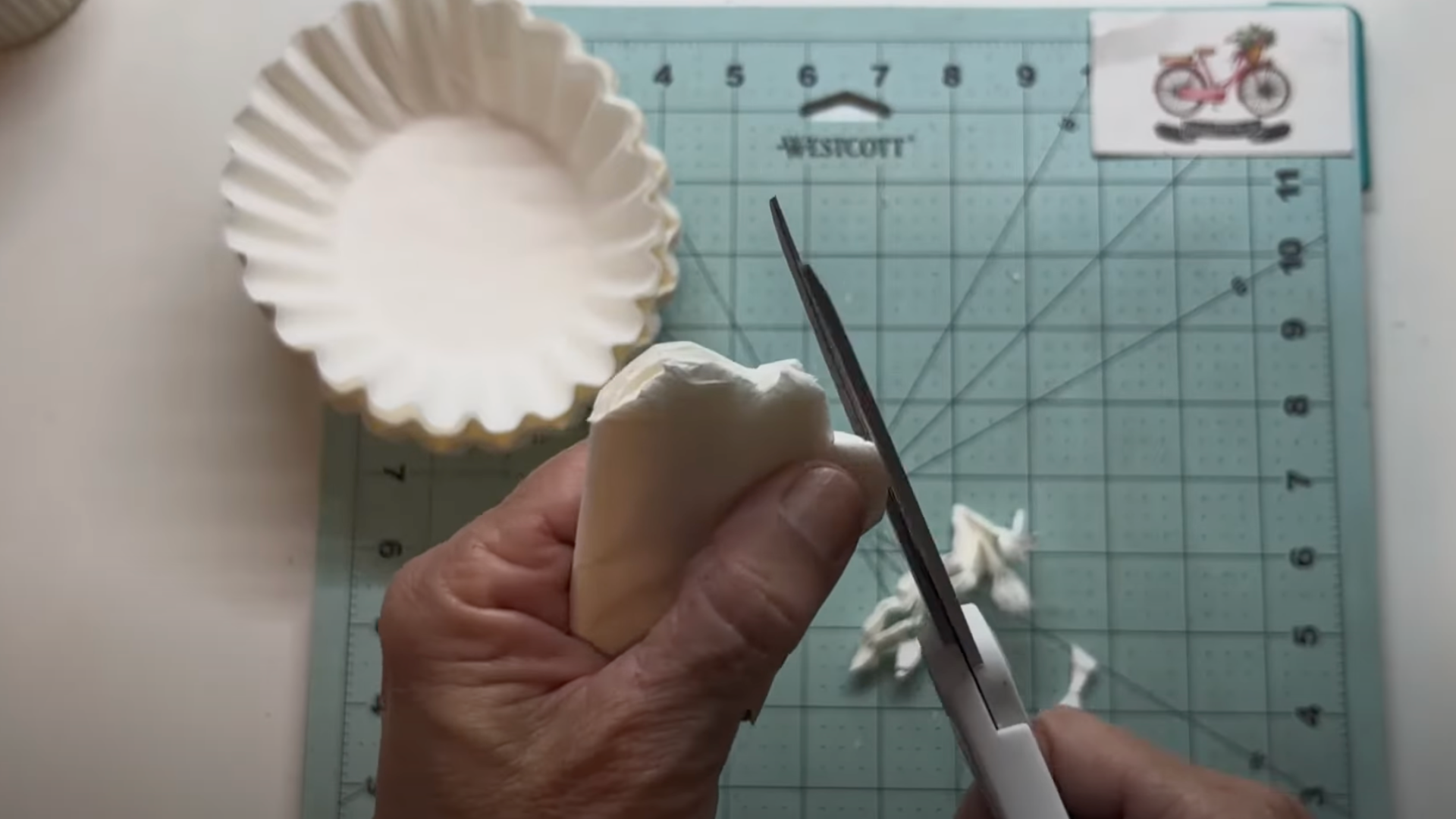 Once dry, fold each filter again and cut along the edge to create petal shapes. You can freehand for a natural look or use a printed template for symmetry.
