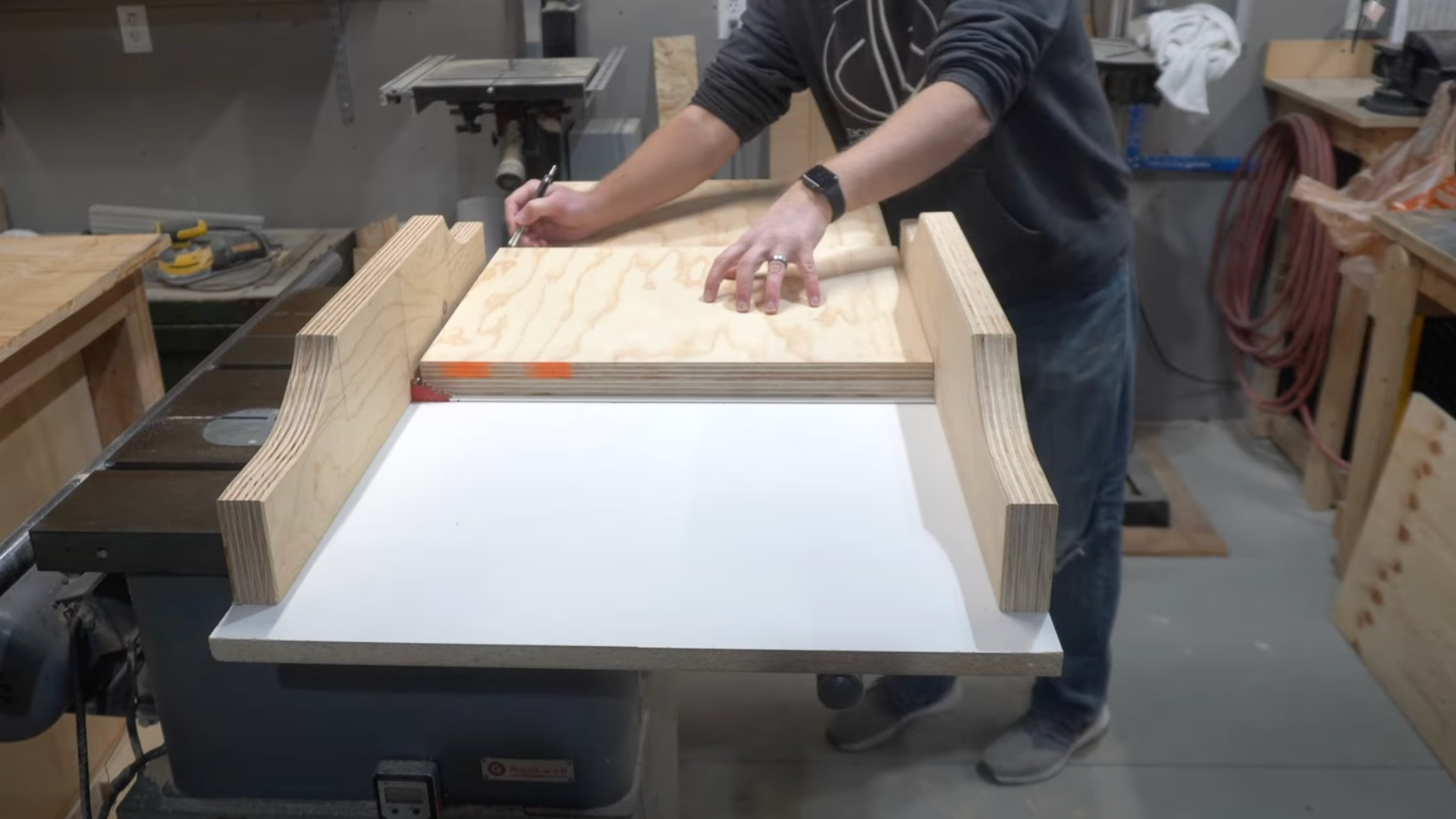Get your plywood and mark all the pieces you need to cut. You’ll need pieces for the top, sides, and any storage spots.