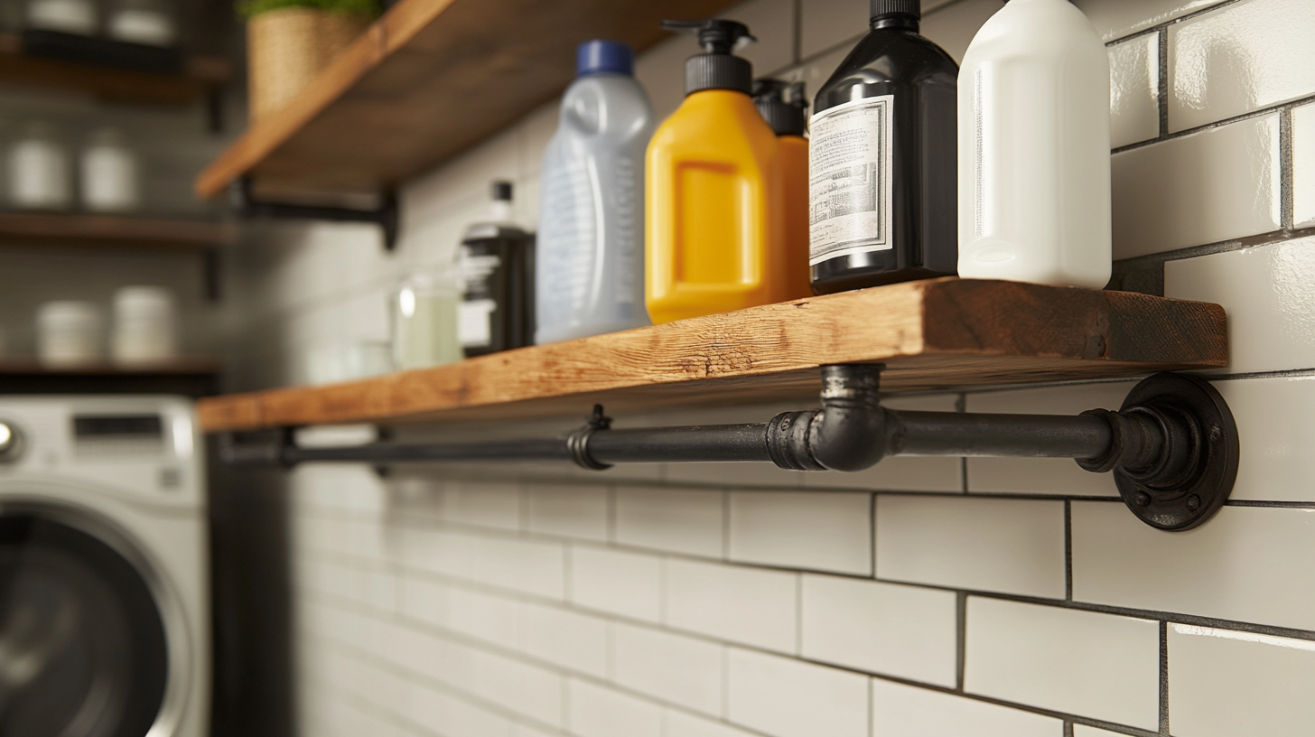 They work great for keeping soap, dryer sheets, and small baskets within reach. Make sure to attach them to wall studs for good support.