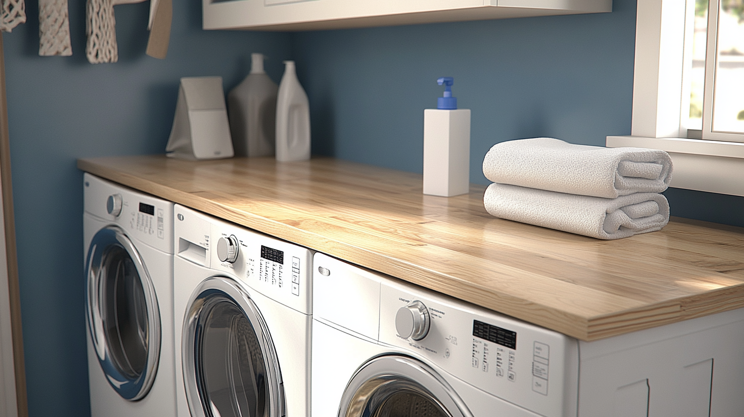 Create a simple work surface using plywood cut to fit over your washer and dryer. Sand the edges smooth and seal with a waterproof finish.
