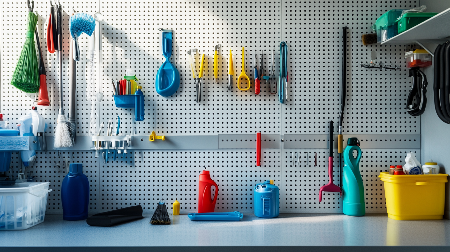 Paint the pegboard to match your room or make it stand out as a focus point. It works for brooms, dustpans, and spray bottles.