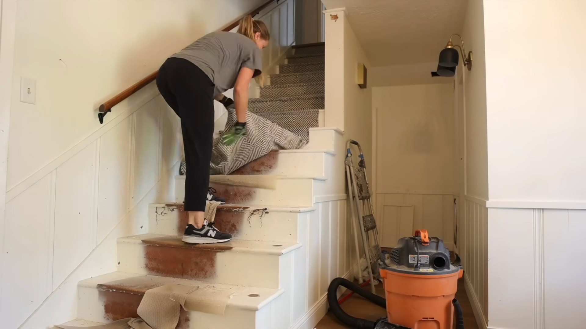 After the railing was gone, the dirty, worn stair runner came out next. This step was harder than expected.