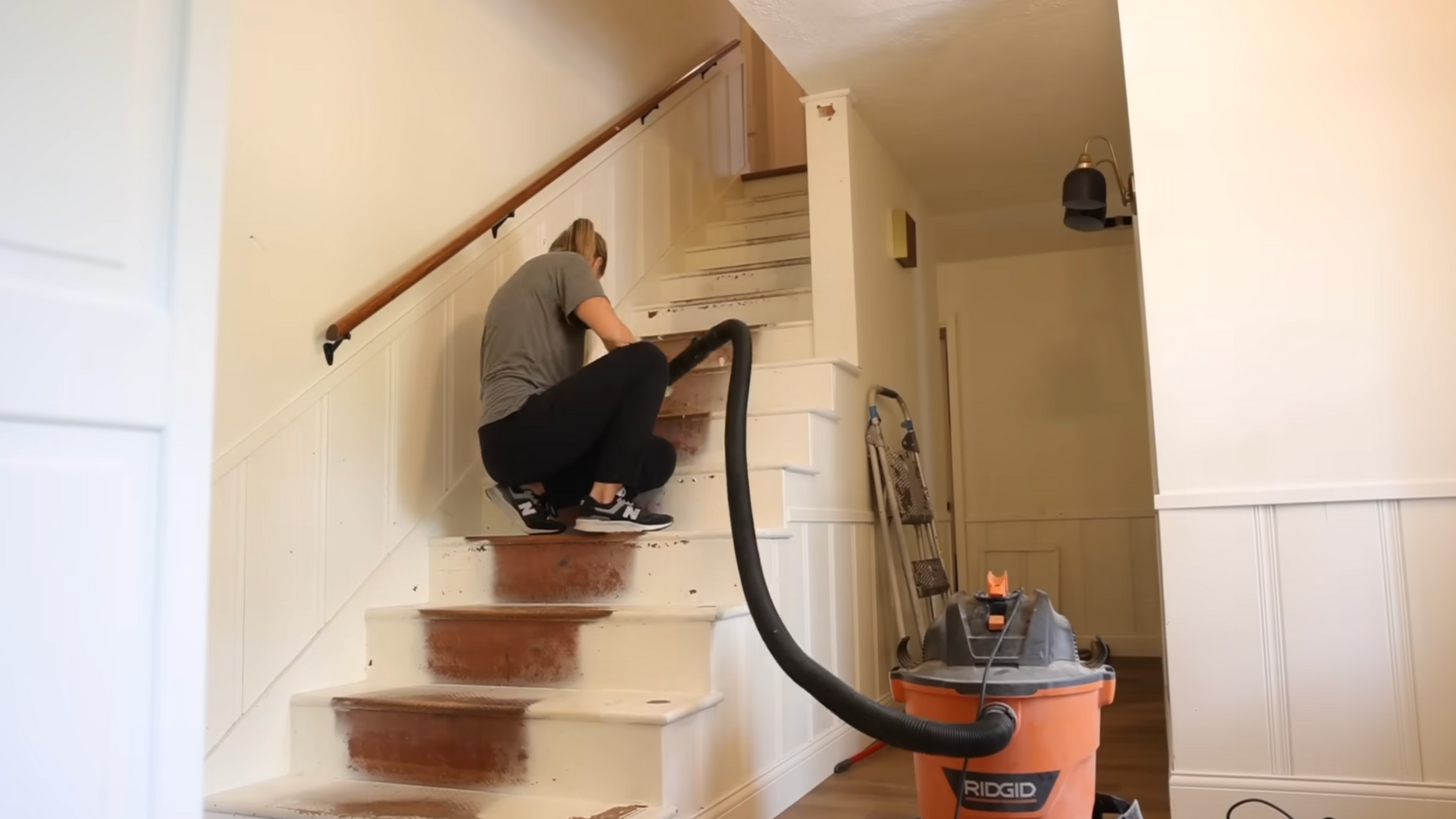 Once the runner and staples were removed, the entire staircase was vacuumed and wiped down.