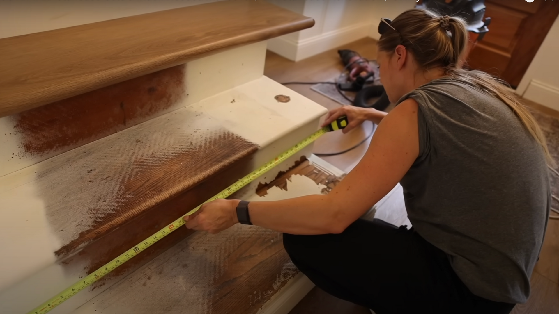 Using stair tread overlays that matched their vinyl plank flooring, the team measured each stair carefully.