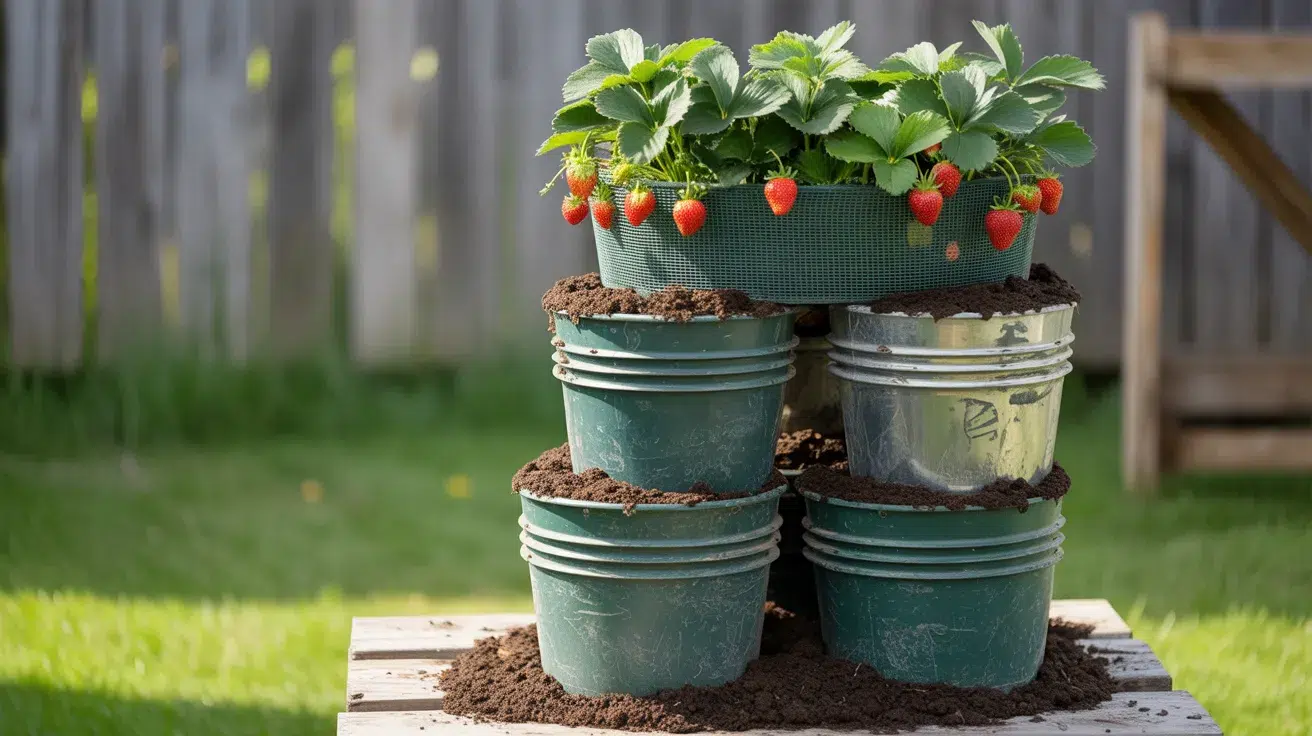 If you’ve got old buckets, don’t toss them—turn them into a sturdy strawberry tower. Stack two or three, drill holes along the sides for planting, and a few at the bottom for drainage.