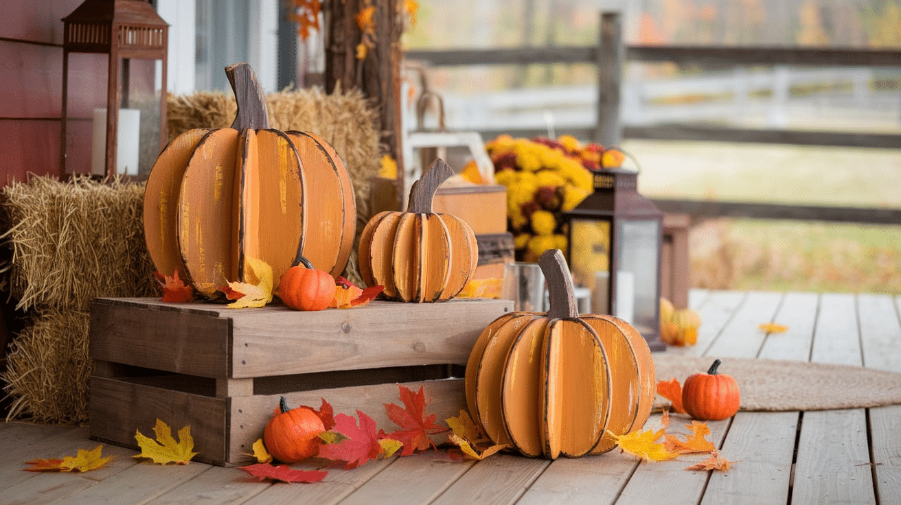 - Front Porch: Place large wooden pumpkins near your front door with hay bales, lanterns, and real pumpkins for a welcoming entrance.