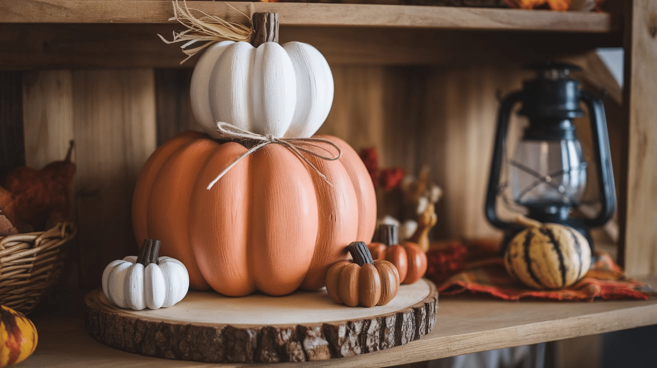 Create a unique decoration by stacking different-sized wooden pumpkins for a layered look.
