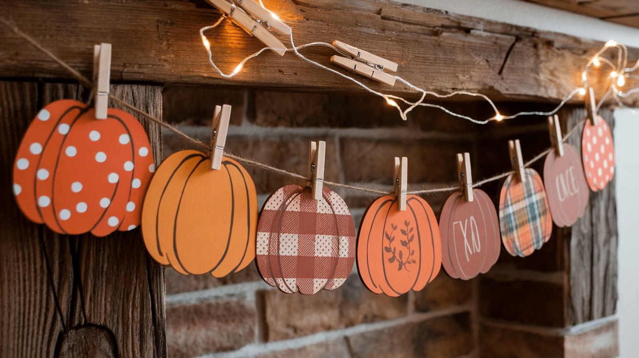 A wooden pumpkin garland is a fun way to decorate mantels, windows, or doorways.