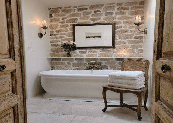 Stunning stone walls and stone floors can make your tiny space look fresh out of a castle or a French chateau. You can further incorporate a freestanding tub, a glass shower, and some white paint on the remaining areas of the walls. A crystal chandelier will be mesmerizing to look at.