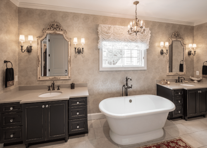 Further, you can hang a chandelier to make your bathroom appear regal. Besides this, if you have bay windows in your bathroom, you can hang some lace and sheer curtains. If you don’t wish to hang curtains, you could also use some rattan shades for privacy, but curtains can allow you to enjoy the outside view better than shades.