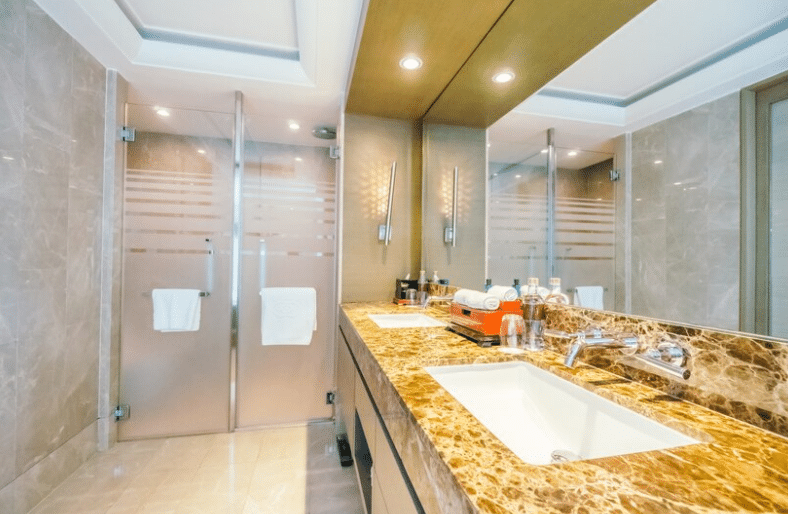 This will offer a look of richness and abundance to your bathroom space. You can also place some white-colored double sinks coupled with a marble top. Natural stones will keep things chic and delightful.