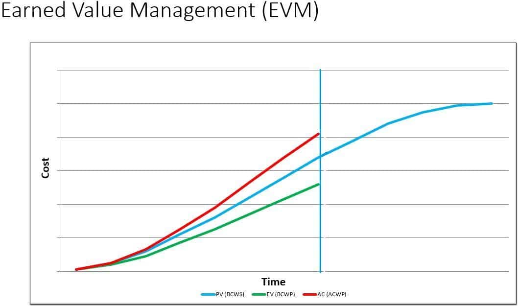 Below is a sample chart used for Earned Value Management (EVM). This chart shows the Planned value (PV or BCWS), the Earned Value (EV or BCWP), and the Actual Cost (AC or ACWP) at a certain point in time (Data Date).