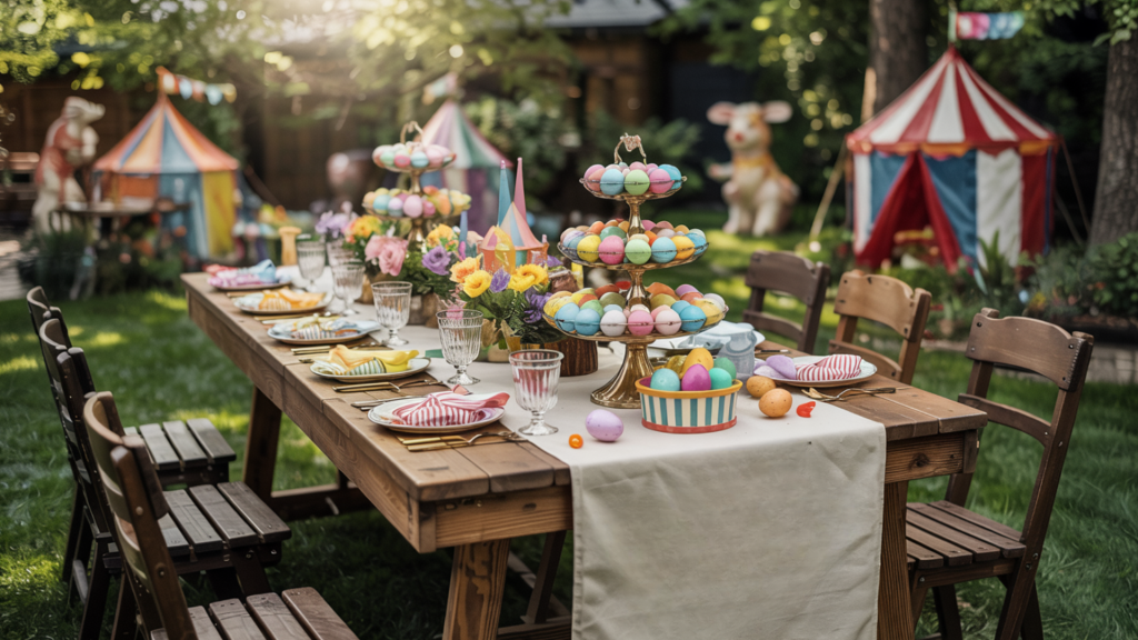 Use circus-inspired table settings with striped napkins, candy-colored tableware, and whimsical centerpieces.