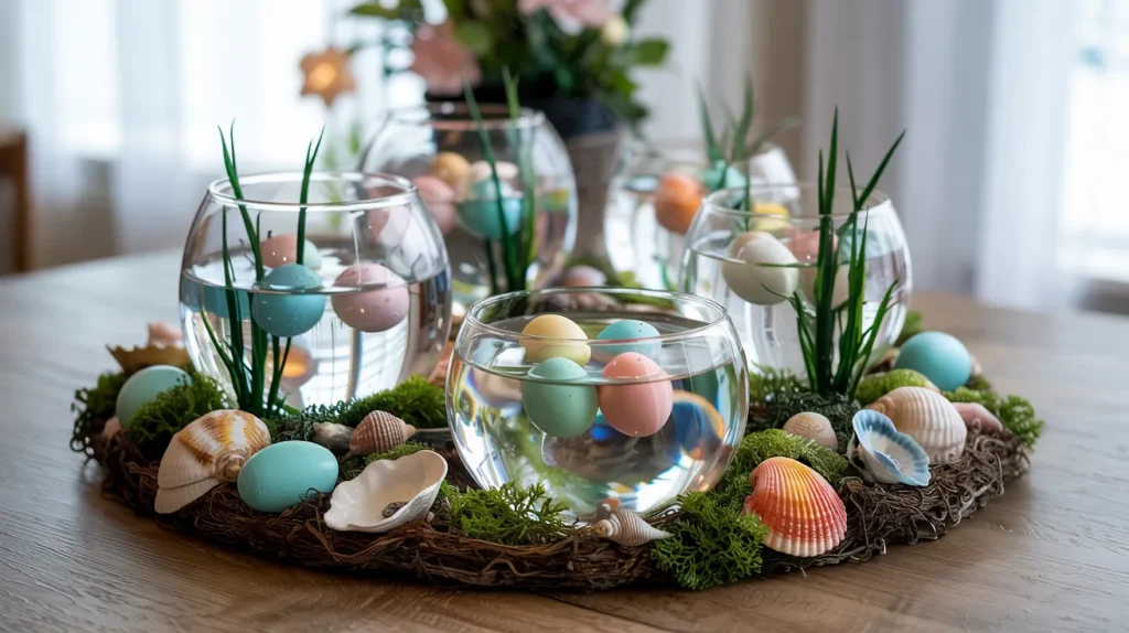 Add seashells, starfish, and beachy elements for a beach-inspired Easter celebration. These coastal touches bring a fun, lighthearted vibe, perfect for an Easter table with a seaside theme.