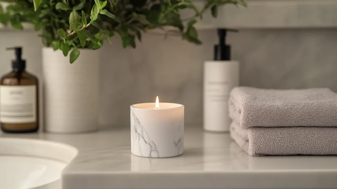 Set a marble candle and a nice skincare bottle side by side. Choose smooth marble in white or gray. It feels fresh and grown-up. Light the candle when you take a bath.