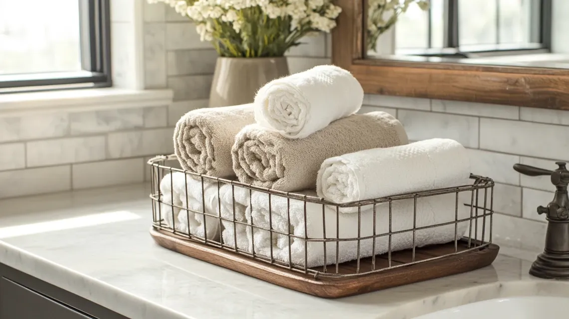 Roll your hand towels instead of folding them. Stack them in a small pile. You can place them in a wire basket or on a wooden board.