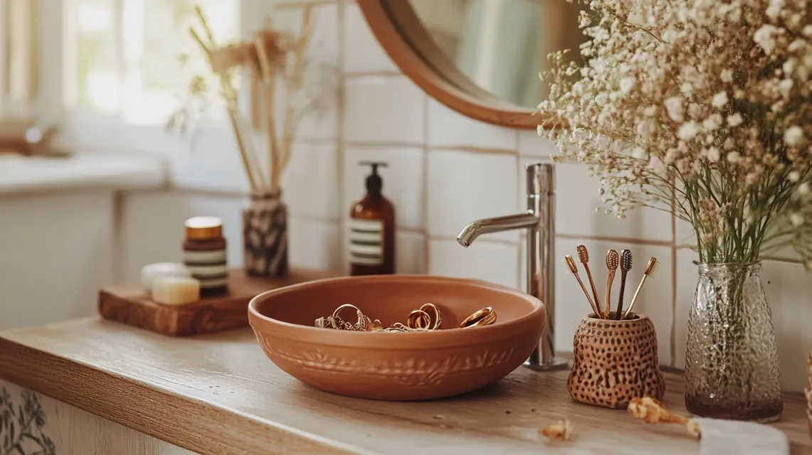 Use a small clay dish to hold rings or earrings while you wash up. It adds a warm look to your counter. You can even paint the dish for fun.