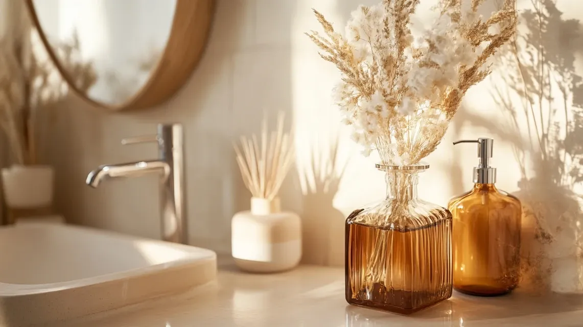 The vase can be plain glass or white. Place it near the sink or corner. It brings a calm and soft touch.