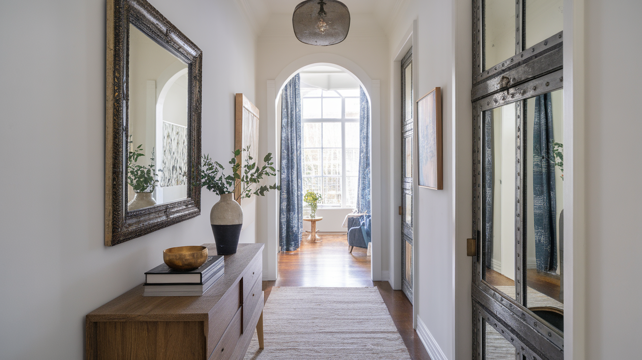 These mirrors don’t just reflect light; they can become a stylish focal point that complements the hallway’s design, helping to tie together the surrounding decor.