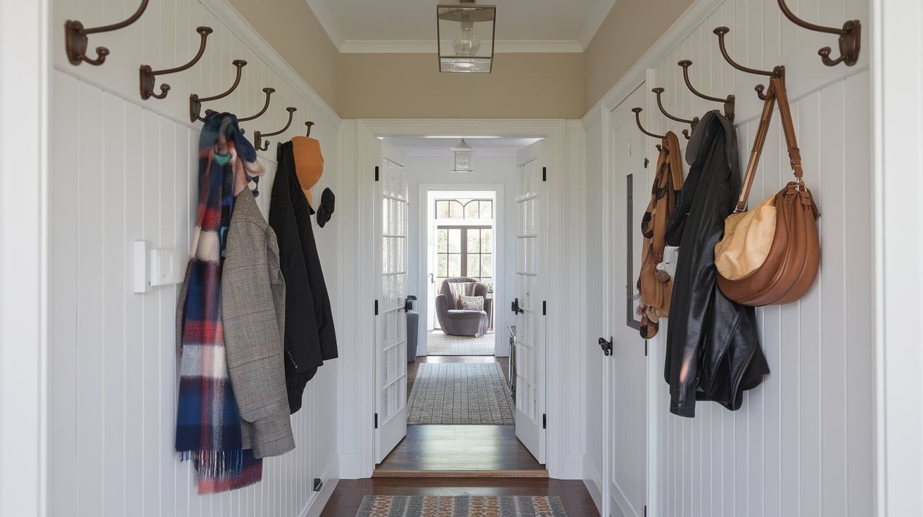 Coat racks or hooks at the end of the hallway offer a simple, yet highly functional way to keep your outerwear and accessories organized.