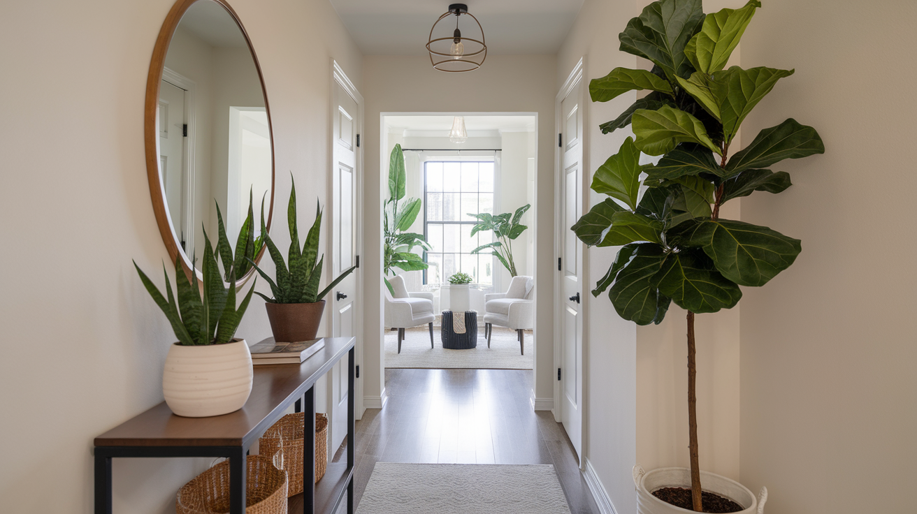 Incorporating greenery at the end of your hallway brings life and vibrancy to the space. Tall indoor plants, such as a fiddle-leaf fig or a rubber tree, can fill the space without overwhelming it. These plants add a natural touch and help purify the air.