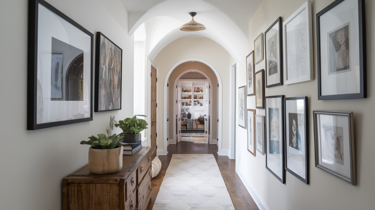 Adding artwork or photography to the end of the hallway can create a personalized touch. A gallery wall with framed art, family photos, or prints can add personality and give the space a distinct vibe.
