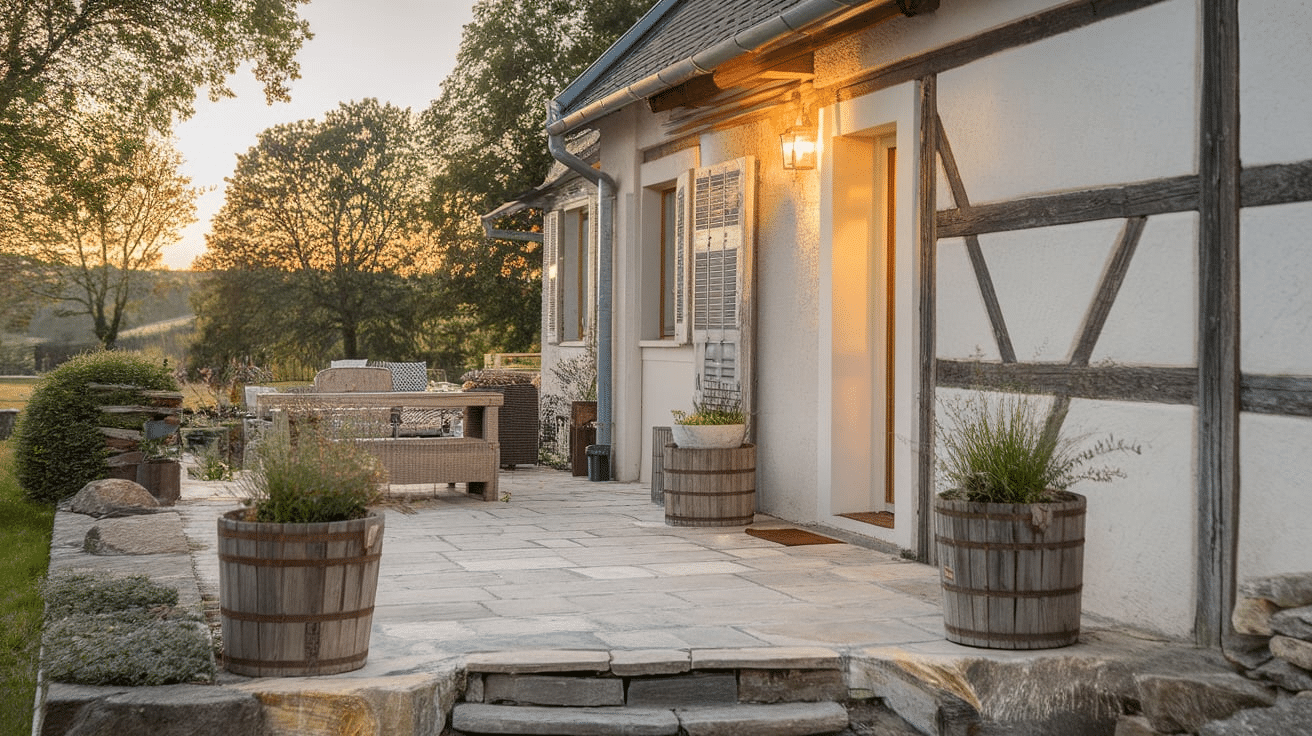 - Wooden Planters and Terracotta Pots: Use aged wooden planters or rustic clay pots filled with herbs, flowers, or small trees to add greenery.