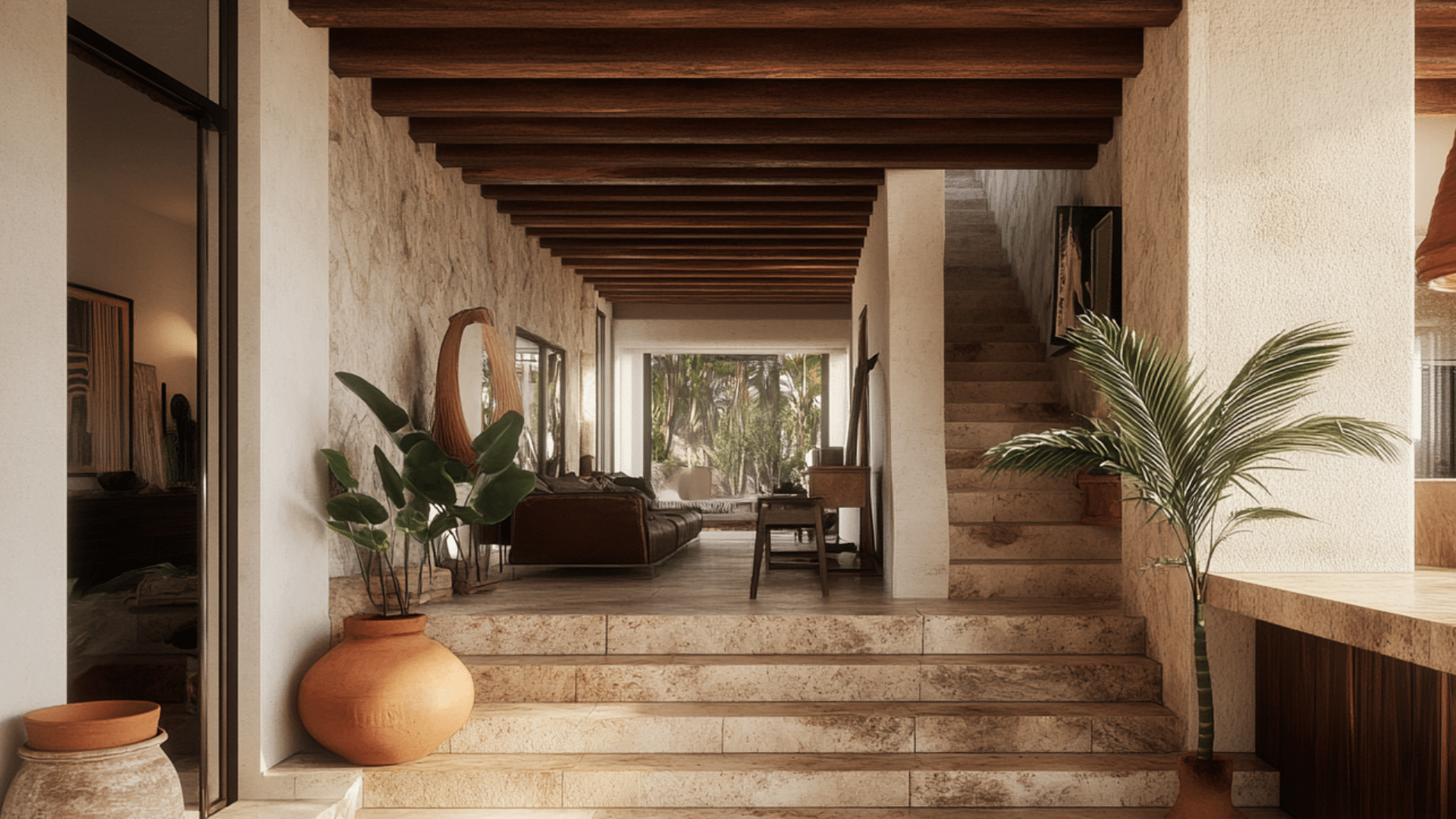 Courtyards, pergolas, and terraces function as year-round living spaces. Plants like vines, citrus trees, and herbs add life to these areas.