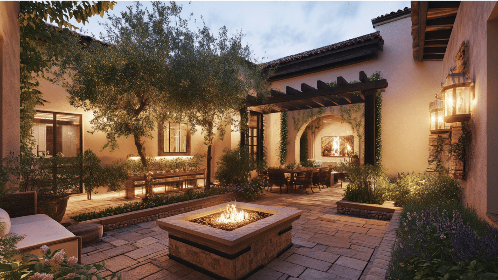 Courtyards offer private outdoor areas, often centered around a small fountain or fire pit. Patios extend living space with comfortable seating for both dining and lounging.