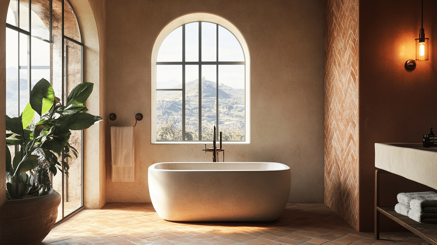 Modern Mediterranean bathrooms feel like personal spas. For a seamless look, walls might be finished in water-resistant plaster or concrete.