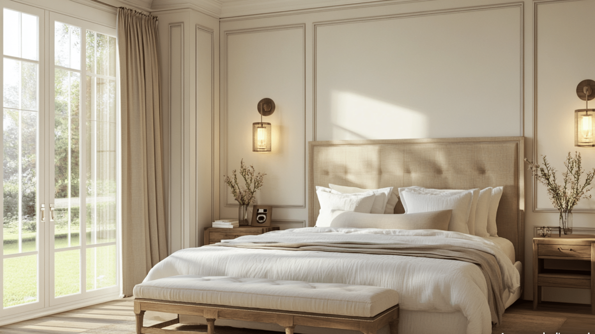 Warm lighting comes from simple wall sconces or bedside lamps with ceramic or metal bases. The room stays free of clutter, with just a few needed items kept in view.
