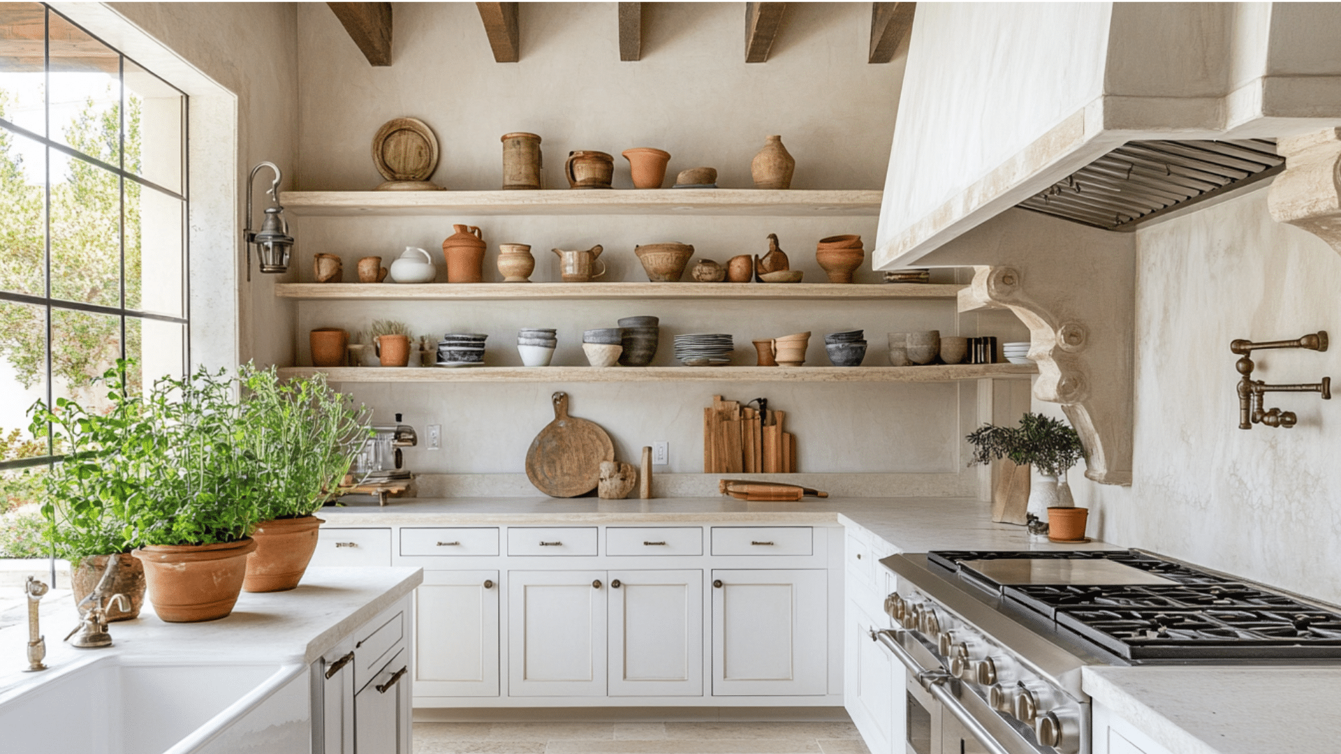 The heart of a Modern Mediterranean kitchen is often a statement range hood—perhaps made of plaster, metal, or stone.