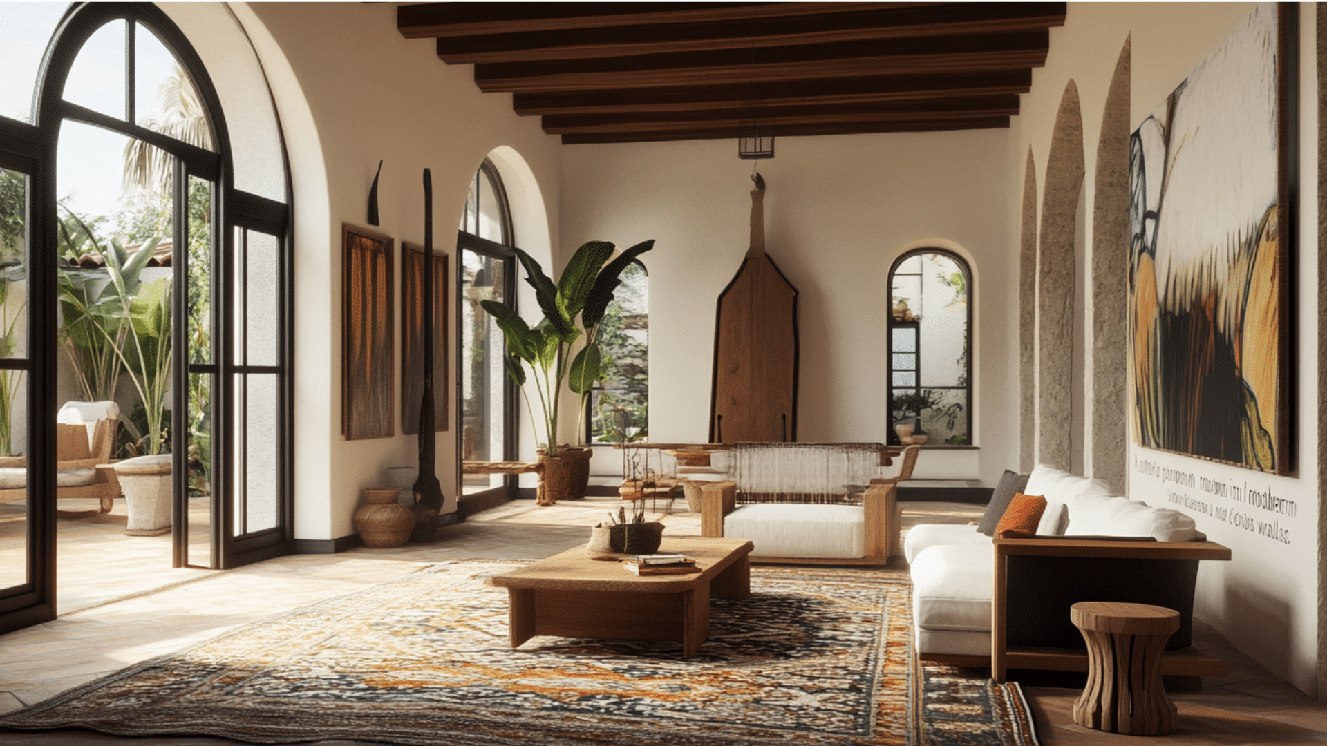 Curved walls or arched doorways soften the space and guide movement between rooms. Layered rugs create comfort underfoot while adding subtle patterns and color.