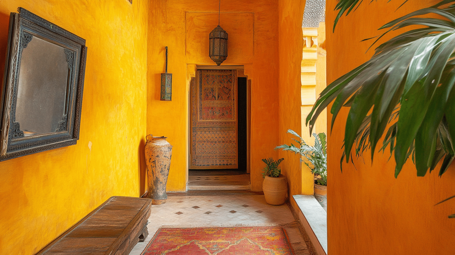 These warm colors remind people of the Sahara Desert. You’ll see them on walls of old buildings and in artwork. They bring a sunny, earthy feel to Moroccan spaces.