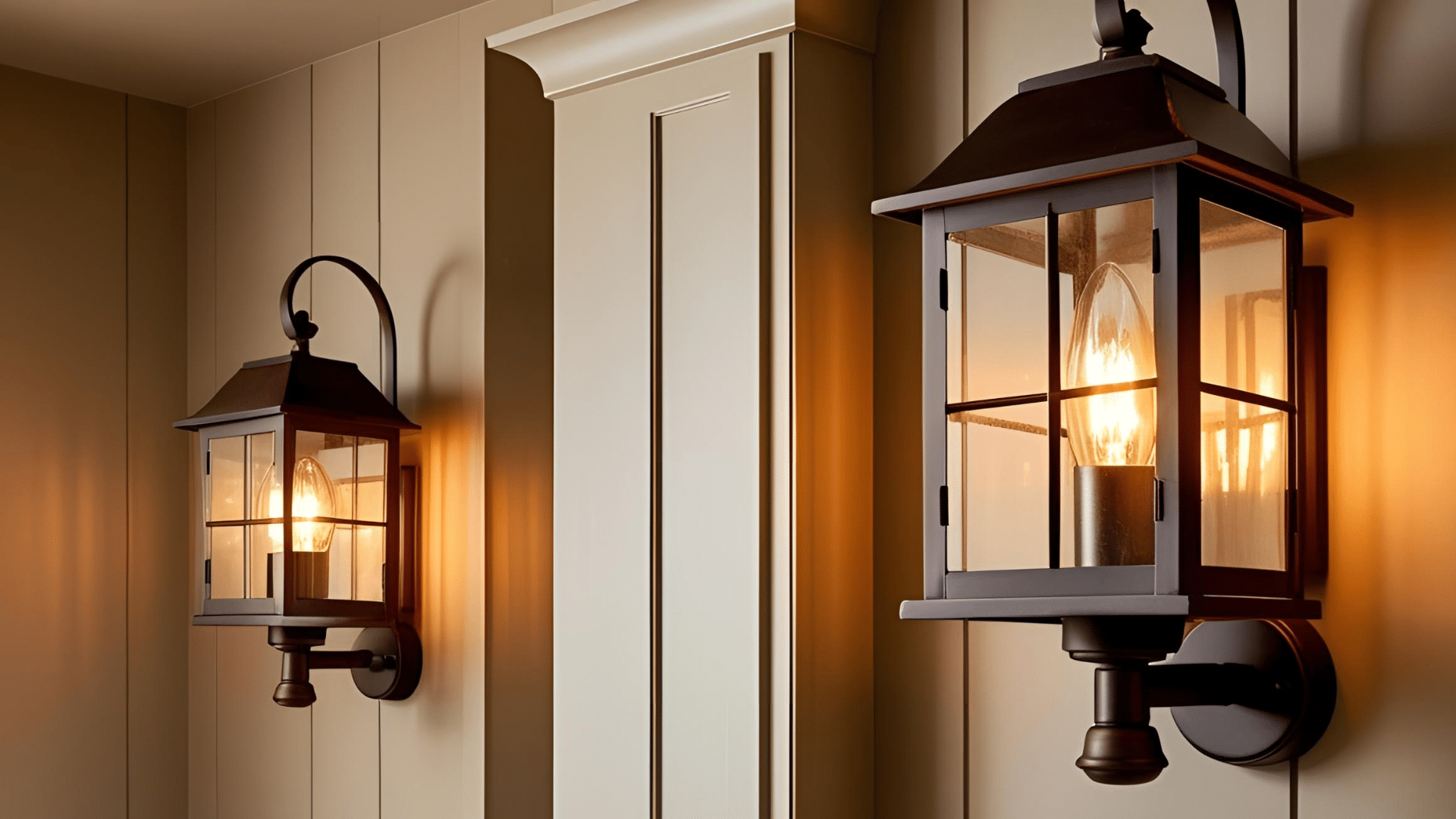 Wall-mounted lantern sconces bring warm, ambient lighting with historical farmhouse appeal. These fixtures cast a cozy glow that softens the bathroom’s hard surfaces.