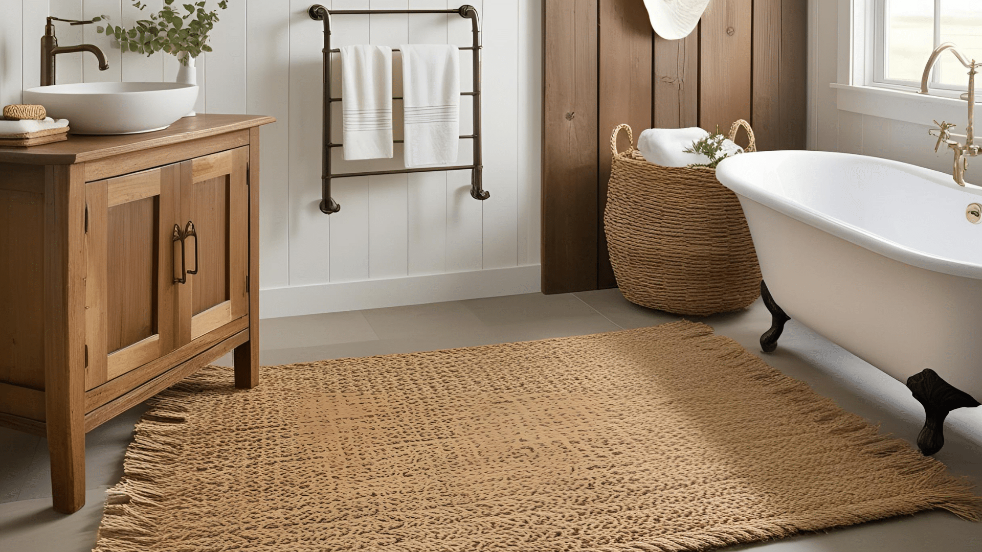 Natural fiber rugs add warmth, texture, and comfort underfoot in farmhouse bathrooms. These organic elements soften the hard surfaces while connecting to the farmhouse’s rural roots.