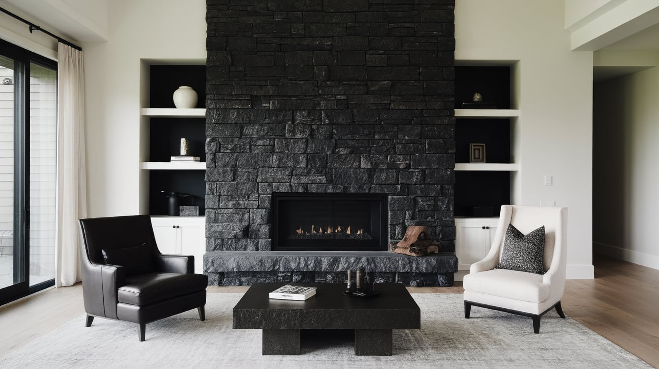 Pairing dark stones, such as Charcoal Rock Panels, with lighter walls creates a bold contrast that draws attention to the fireplace. This high-contrast look works particularly well in large rooms where you want the fireplace to make a bold statement.