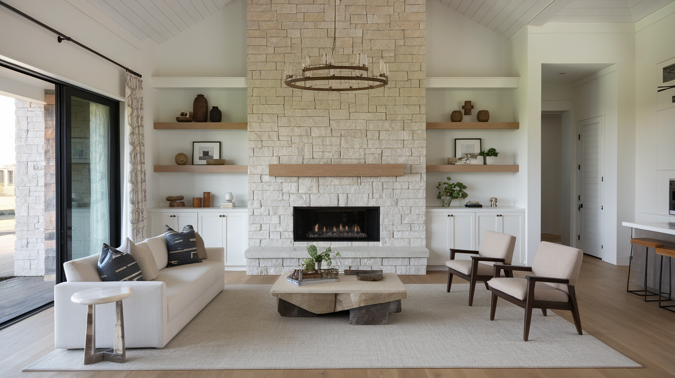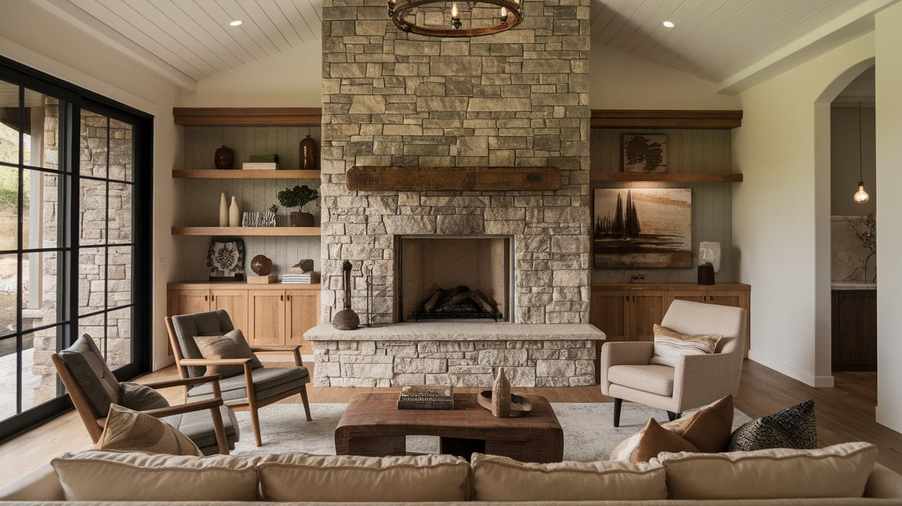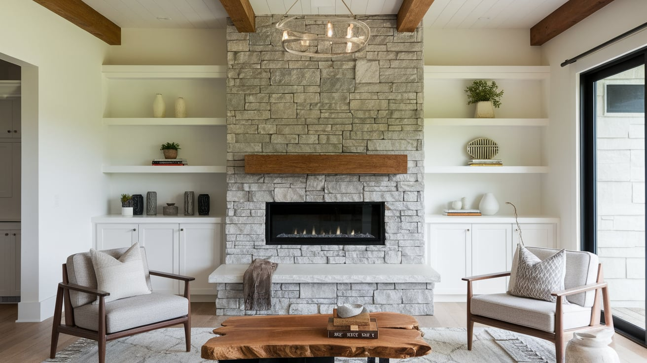 Integrating your stone fireplace into the surrounding decor through shelves, seating, or cabinetry allows the entire space to flow naturally, providing a cohesive and polished design that unifies the room and enhances the ambiance.