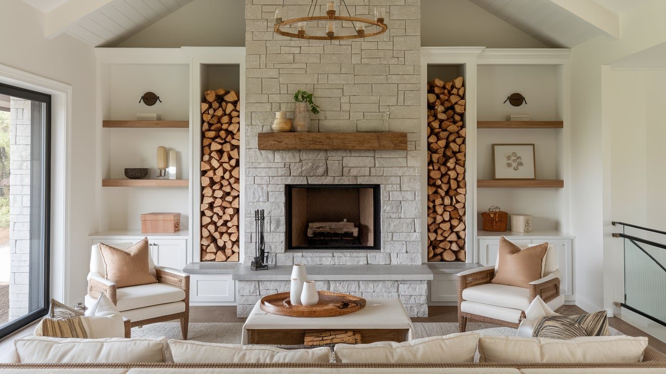 Incorporating built-in wood storage can serve a dual purpose: combining practicality and beauty. A wood storage nook beside the fireplace creates a natural focal point that improves the cozy atmosphere.