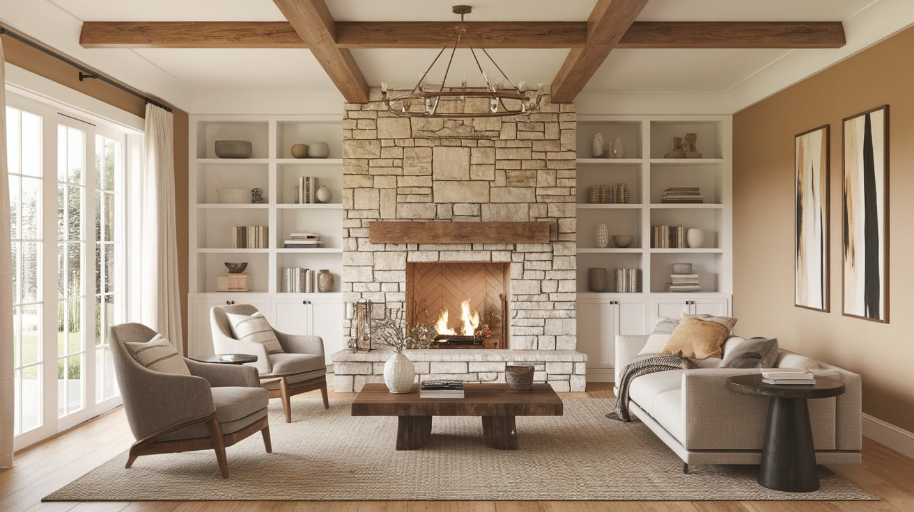 Mixing natural wood beams with sleek, polished stone or incorporating metal accents around the fireplace can create a refined fusion of textures, bringing harmony and richness to the room’s overall design while maintaining a modern feel.
