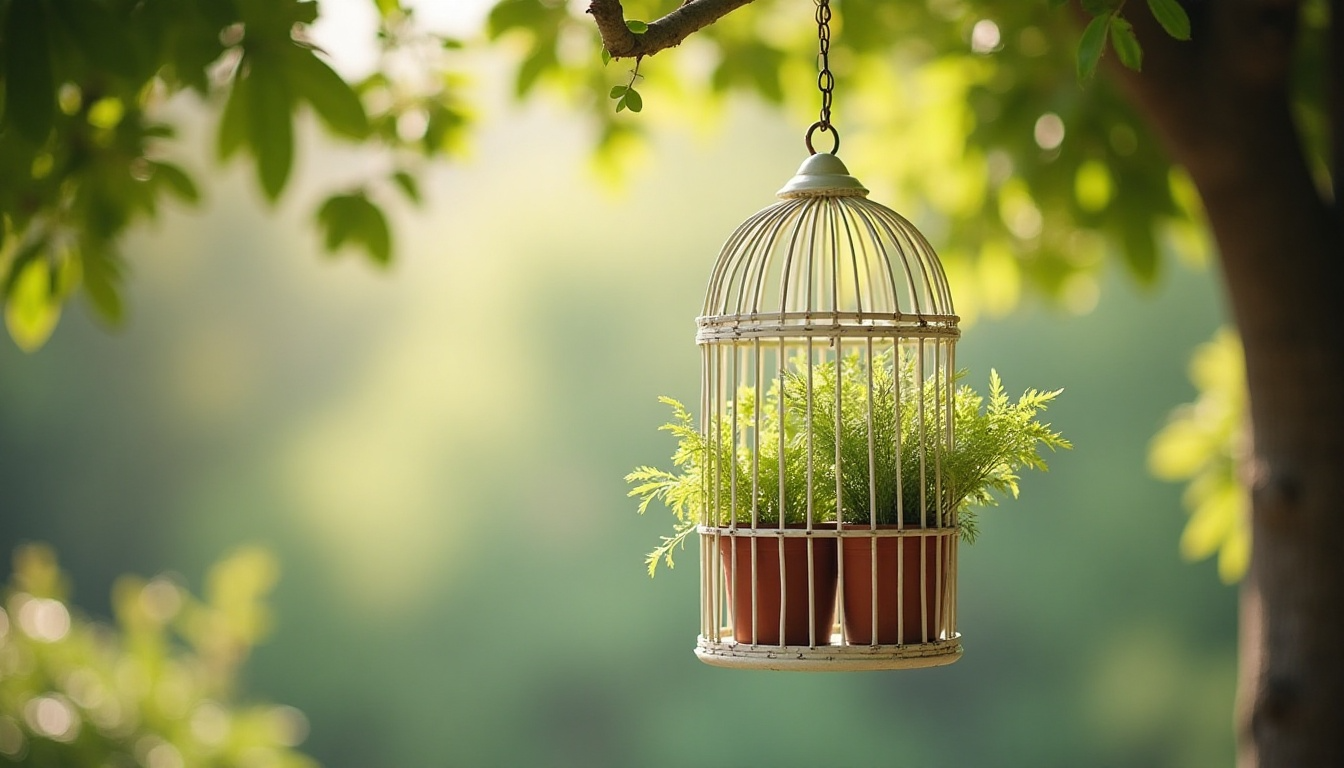 Transform an ornamental birdcage into a whimsical hanging herb garden. Line with sphagnum moss, fill with lightweight soil, and plant trailing herbs that will spill through the cage bars.